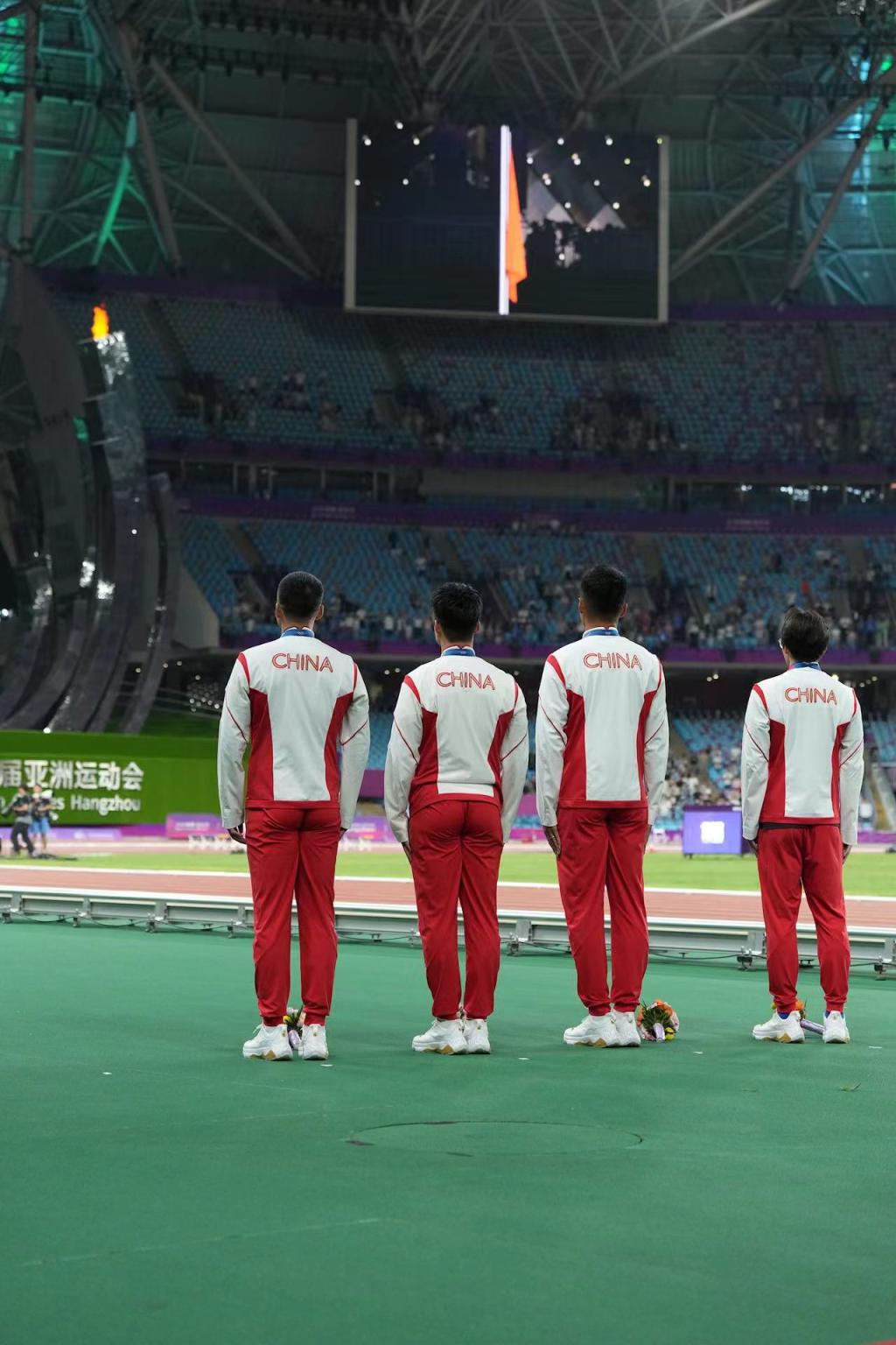 补发现场,首先颁发的是男子4×100米接力铜牌。四位中国小伙子笑着走上铜牌领奖台,接受颁奖。随后的竞走颁奖仪式上,在三位得奖运动员获颁奖牌后,《义勇军进行曲》奏响,三面五星红旗冉冉升起,切阳什姐眼中涌动着晶莹的泪花。